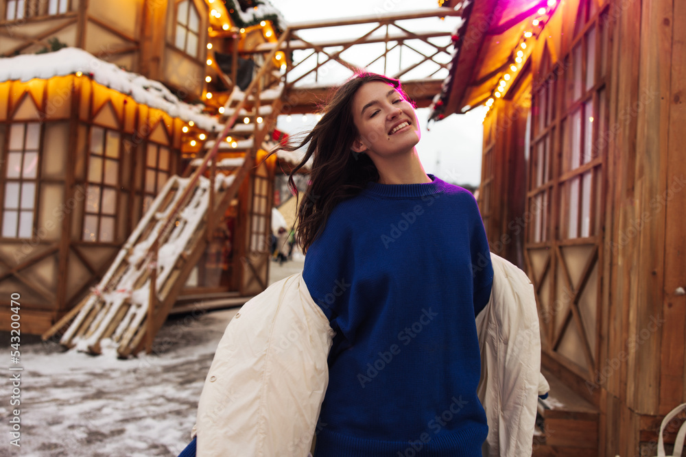 Beiuiful young caucasian female relaxing outdoor with closed eyes during winter evening. Brunette wears dark blue sweater and jacket. Concept of enjoying.
