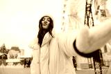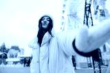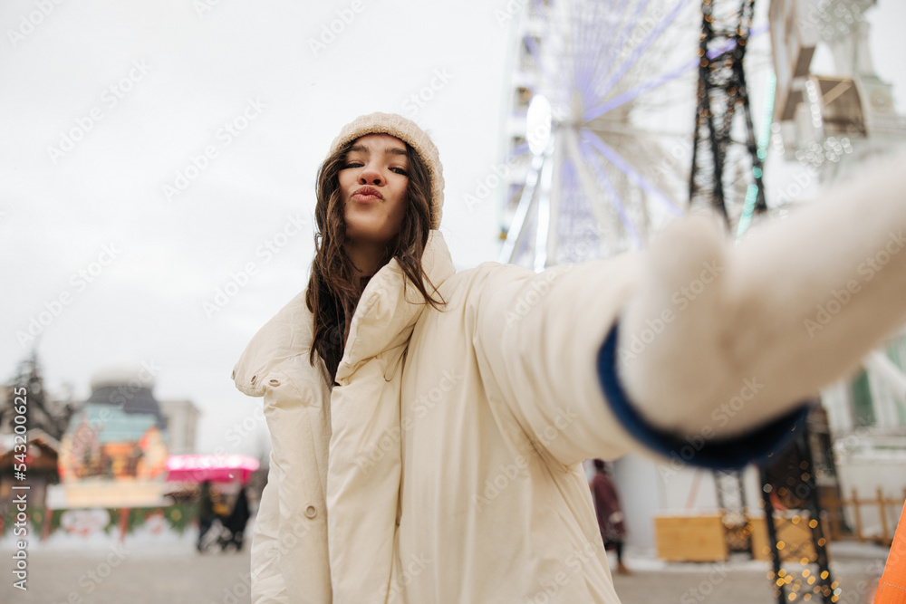 ottom wiev of beautiful young caucasian female streches hand at camera pushing her lips outdoor. Brunette wears hat, warm jacket and gloves. Concept city life, lifestyle.