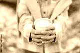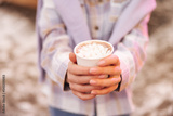Top wiev of hands young caucasian girl holds cup of coffee with hands stands outdoor. Girl wears shirt and sweater. Concept of lifestyle.