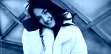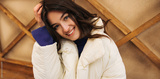 Pretty young caucasian woman looking into camera with smile corrects her hair with hand outdoor. Brunette wears sweater and jacket. Concept rest time.
