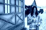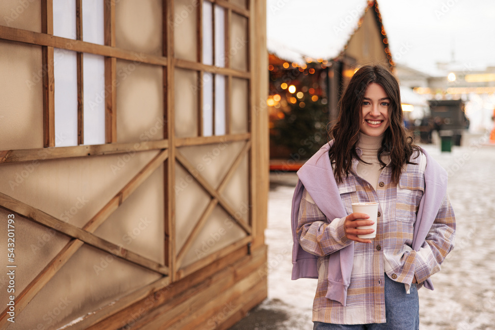 Positive young caucasian girl stands near wooden house with cup of hot coffee during winter evening. Woman with brunette wavy hair wears jeans, shirt and sweater. Rest time, lifestyle concept.