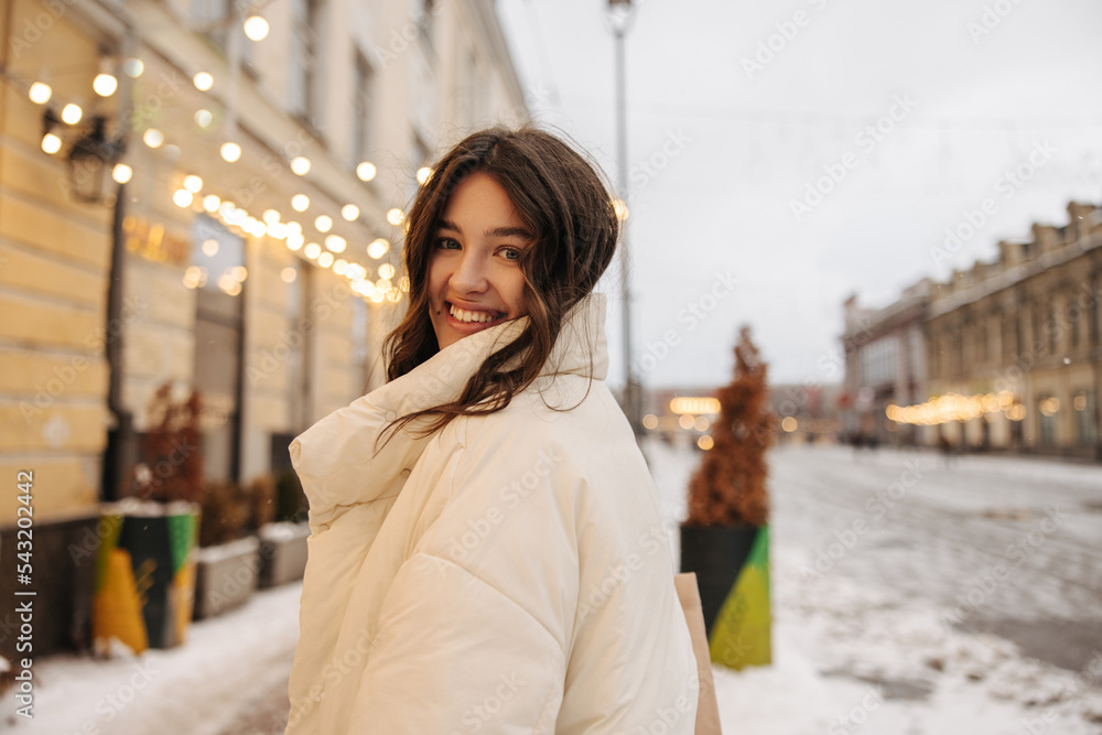 Positive young caucasian woman walking at european street looking at camera with wide smile. Brunette wears white jacket. Leisure concept.