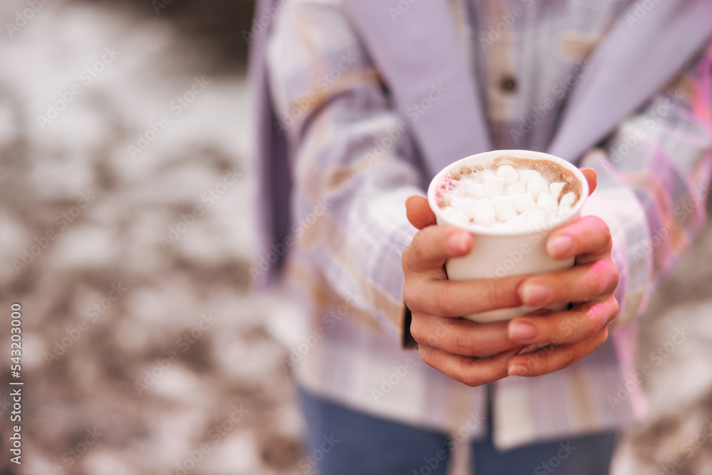 Friendly young caucasian woman looking and smiling at camera behing glass sits indoor cafe. Brunette hair girl wears sweater and jeans. Concept lunch break time.