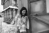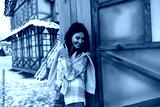 Cool young caucasian woman smiling spends leisure time at amusement park during winter holidays. Brunette wears jeans, shirt and sweater. Great mood, rest time concept.