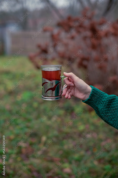 Glass of black tea in vintage metal cup holder in woman's hand outdoor. Close up