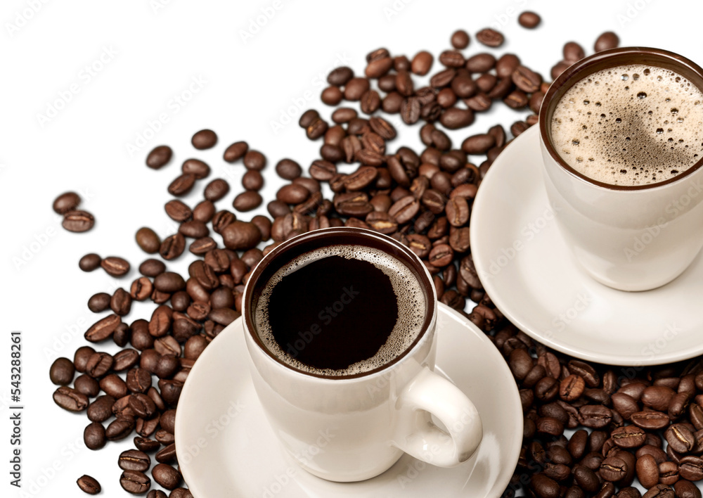 Coffee cups and coffee beans on wooden background