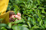 Farmer hand trying to picking tea leaf in tea plantation field.