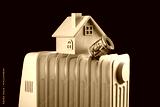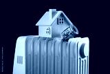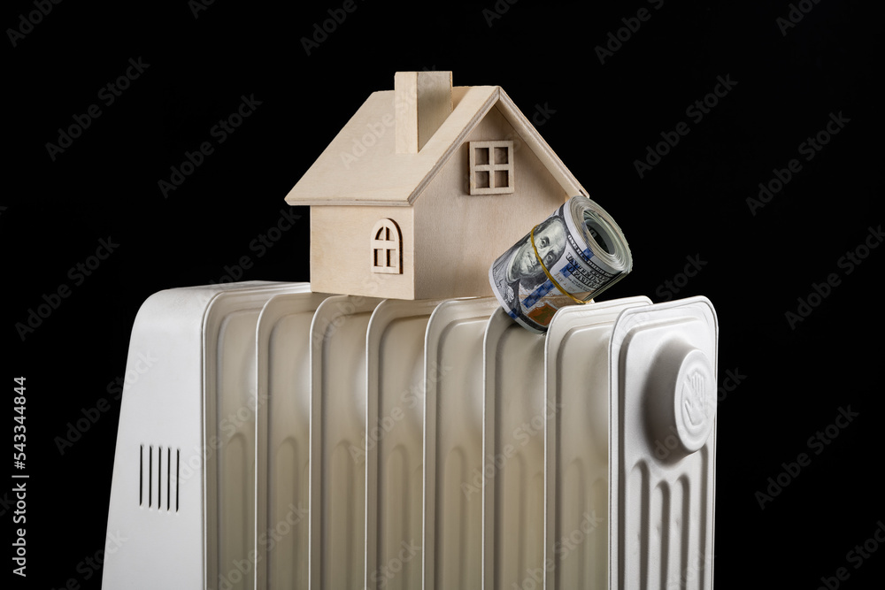 A stack of 100 American dollars banknotes, a symbolic wooden house and an electric heating battery on a black background