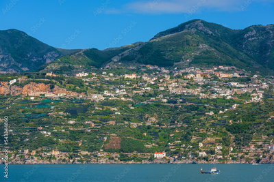 Scenic view of the Amalfi Coast in Italy. The coast is a popular holiday destination with sheer cliffs and rugged coastline with many small beaches and fishing villages
