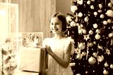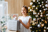 A girl dressed in a white dress stands in a festively decorated room against the background of a Christmas tree with bokeh lights. Opens a gift in a silver package.