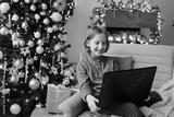 A cute girl is sitting on a sofa with a laptop in a decorated room for Christmas. Communication, meetings and training online.