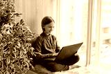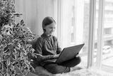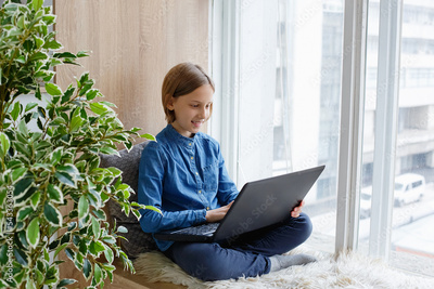 Young cute emotional teenager girl with braids in overalls lies by the window indoor. With cup and cookies, working with the laptop