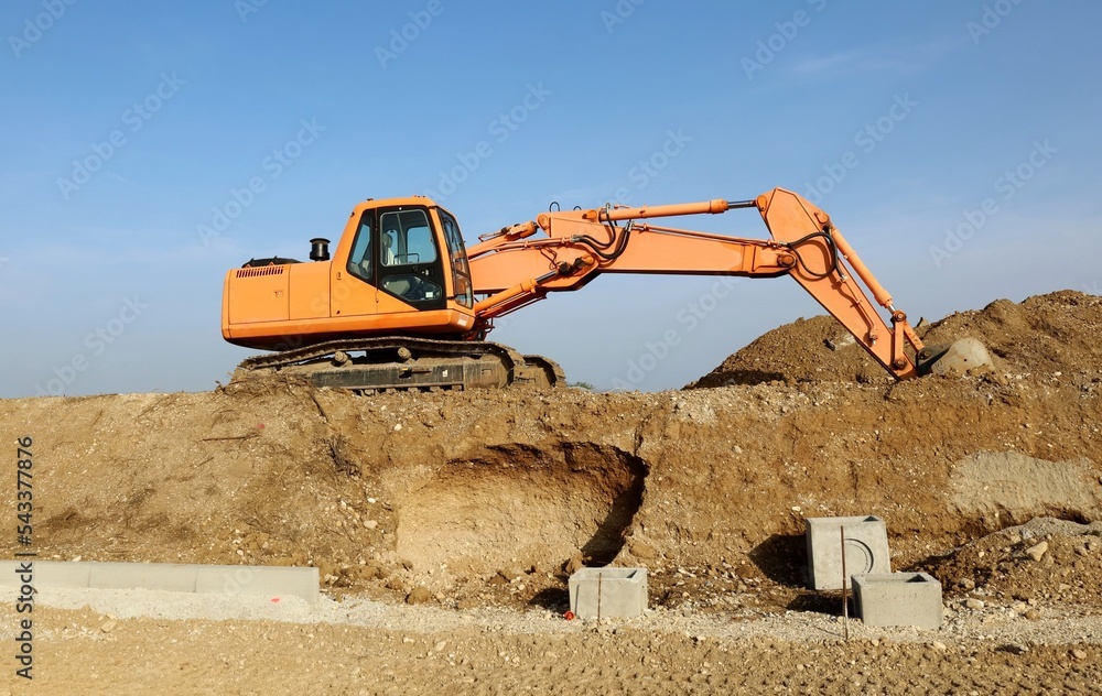 Orange excavator during a road work on a dirt heap with blue sky background. Side view