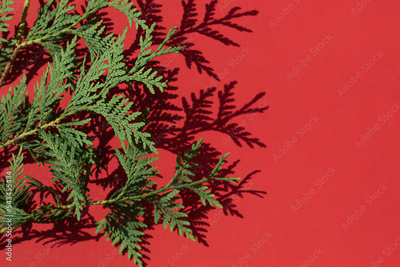 Christmas celebration concept frame with thuja on the red background. Copy space