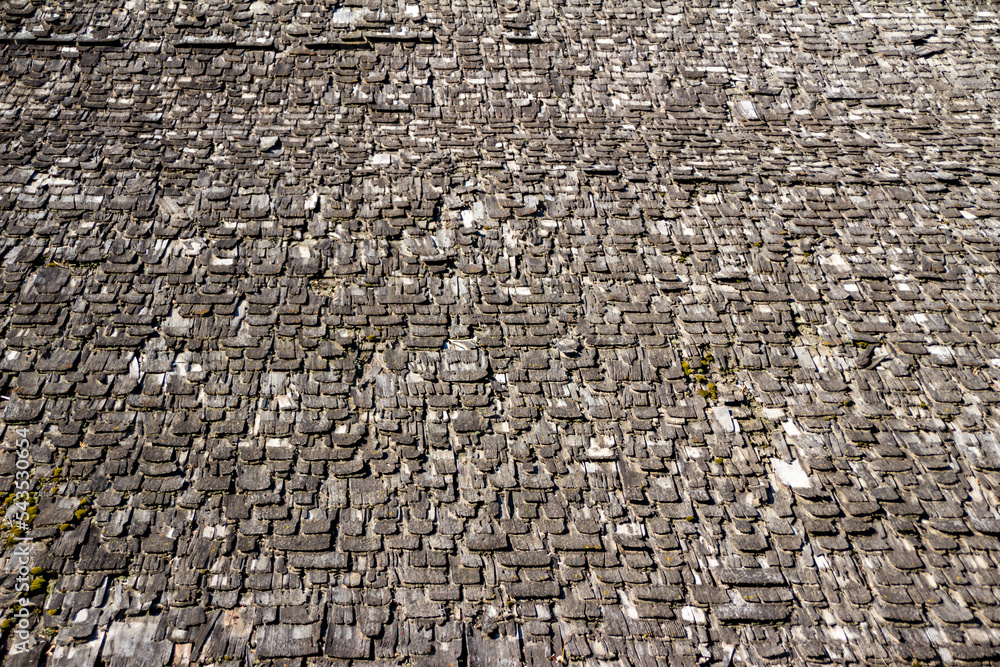 Full frame abstract texture background of a deteriorating century old barn roof comprised of cedar shake shingles