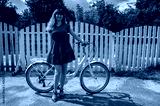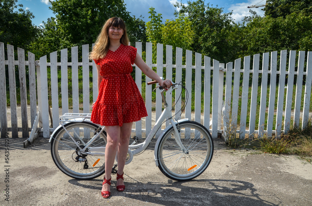 Happy beautiful girl with bicycle. Portrait of young sporty woman wearing red dress enjoy summer day in nature