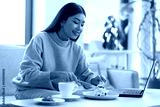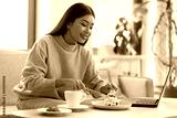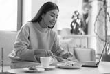 Cute asian girl eating tasty dessert while working at the cozy cafe