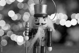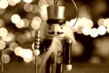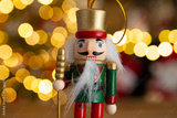 Christmas nutcracker wooden figure. Beautiful, festive toy soldier decoration, with Christmas tree lights bokeh in background.