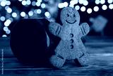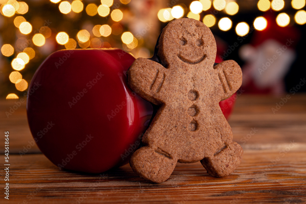 Gingerbread man cookie, red dumbbell and Christmas tree lights bokeh. Healthy fitness lifestyle holiday season, cheat day temptation vs sticking to the diet. Gym workout and sport training concept.