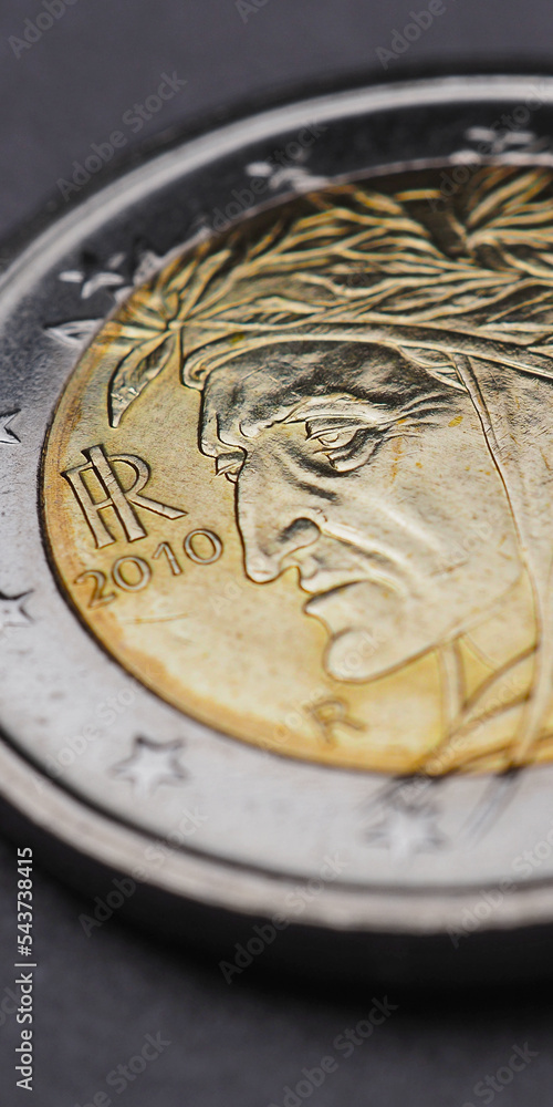 Euro coins close-up. 2 euro coin lies on dark surface. Coin issued in Italy. Obverse depicting Dante Alighieri. Vertical illustration about European Union currency inflation. EU economy news. Macro