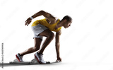 Sport transparent background. Sprinter leaving starting blocks on the running track.