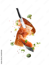 Isolated of flying raw salmon fillets with knife and falling herbs and spices