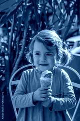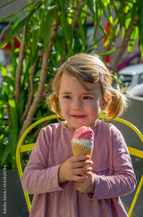 Little blond girl sitting in chair eating ice cream and smiling.