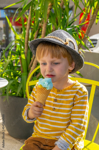 Little boy eating ice cream in an outside setting with yellow chair