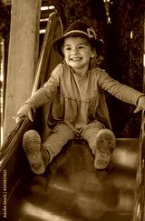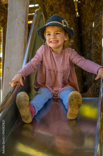 Little blond girl with hat sitting on top of a slide smiling.