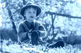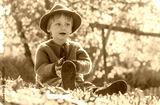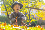 Little boy with hat sitting outside in grass during fall season having fun with leaves.