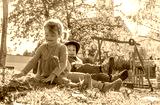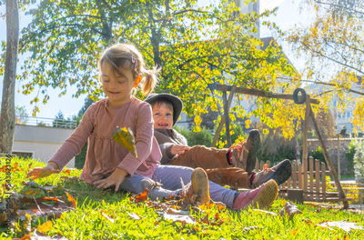 Young Children - boy and girl - playing in the park in autumn having fun