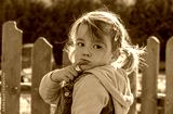Young Blond Girl in pink and blue sweater looking into the camera