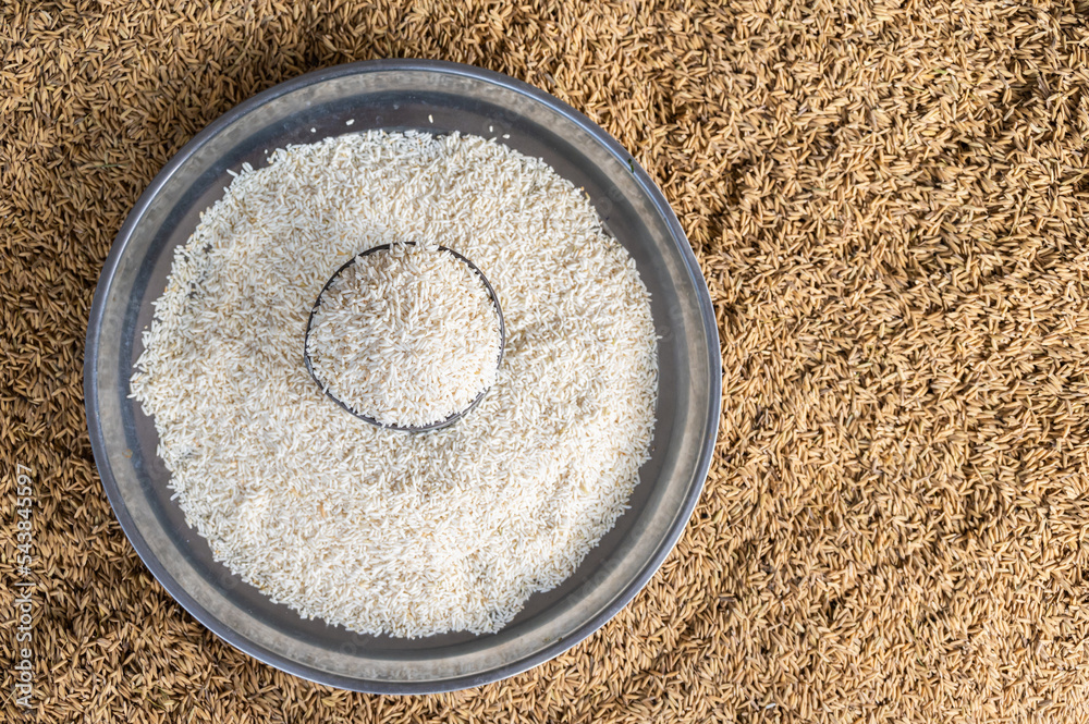 White rice containing on metal tray with paddy rice on the background. Rice is a staple crop for much of the world's population.