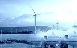 H2 fuel storage tank with green hydrogen concept. Sustainable renewable energy. Net zero emissions by 2050. Solar panel and wind turbine generate electricity for hydrogen gas production. Clean energy.