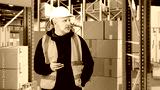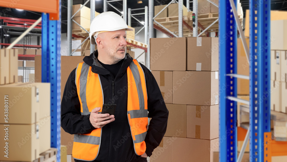 Man is storekeeper. Customs warehouse worker with phone. Guy in helmet stands among boxes. Storekeeper looks away. Man in interior of warehouse. Racks with boxes behind man storekeeper