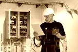 Man next to electrical panel. Electrician at work. Guy with tablet fixes electrical equipment. Man electrician reads documentation from electrical equipment. Power shield with wires fixed on wall