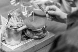 fast food and people concept - close up of man with fork and knife eating burger and french fries at restaurant
