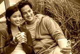 Asian Man Woman Romantic Couple on Beach Steps Drinking Coffee or Tea
