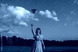Young brunette smiling woman throwing paper plane in the air. Hope and dream concept