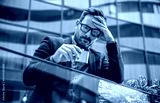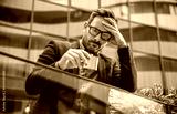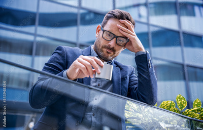 Business, stress and alcoholism. Fired depressed businessman drinking alcohol in front of corporation. Business concept