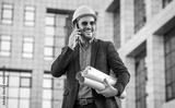 Construction supervision. Satisfied architect making inspection on building site and talking with client via mobile phone. Construction concept