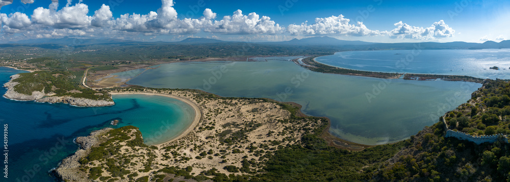 Ruins of the old Venetian fortress above the blue waters of Navarino beach in Greece