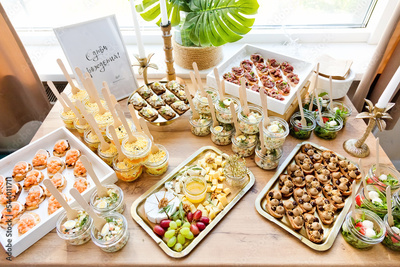 Buffet at the reception with fresh fruit. The range of canapes, the concept of banquet service. Catering food snacks for catering