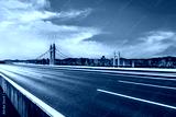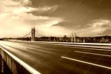 Asphalt road and bridge with city skyline at sunset in Zhoushan, Zhejiang, China.