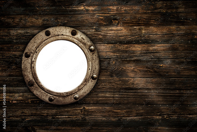 Close-up of an old rusty closed empty porthole window. Old rich wood grain texture background with knots.