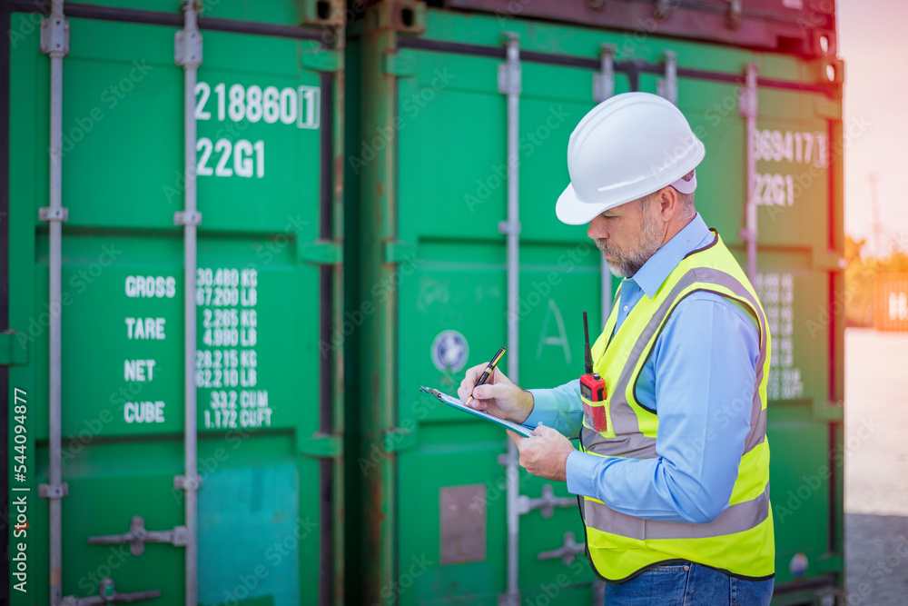 Engineer working in the construction container dock yard checking and inspection containers data on file document is container shipping Logistics business concept.