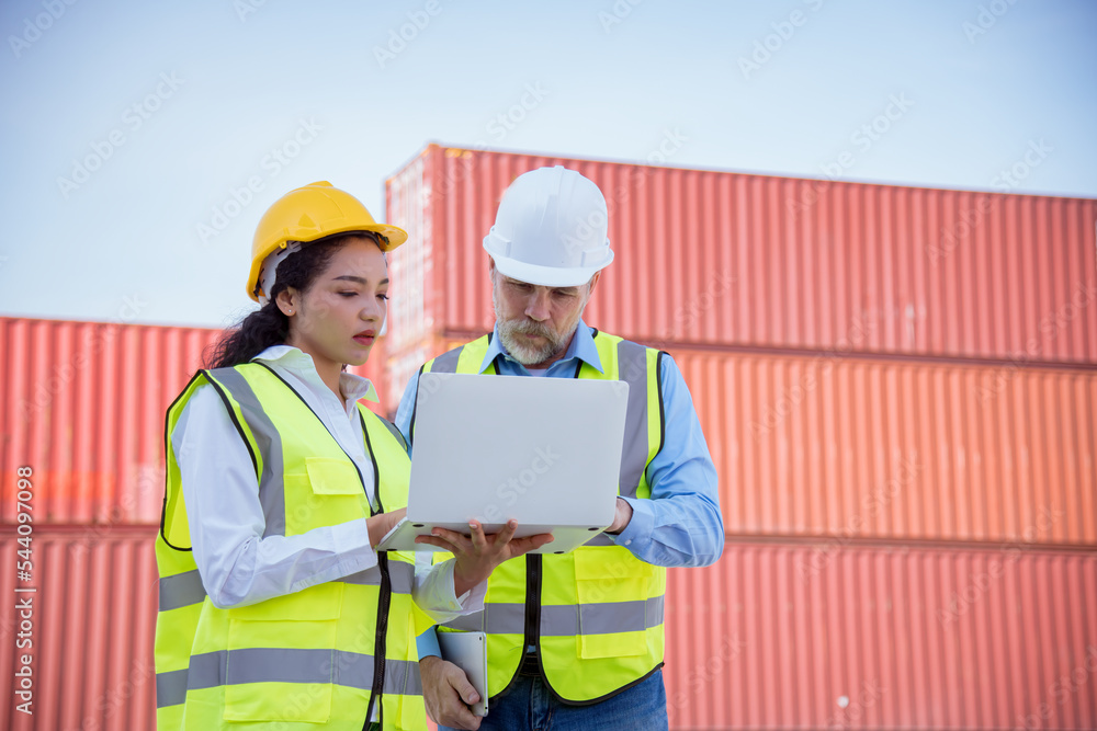 Engineer working in the construction container dock yard checking and inspection containers data on laptop program is container shipping Logistics business concept.
