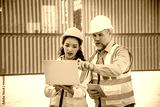 Engineer working in the construction container dock yard checking and inspection containers data on laptop program is container shipping Logistics business concept.