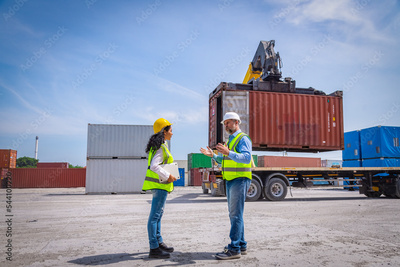 Engineer working in the construction container dock yard checking and inspection containers data on laptop program is container shipping Logistics business concept.