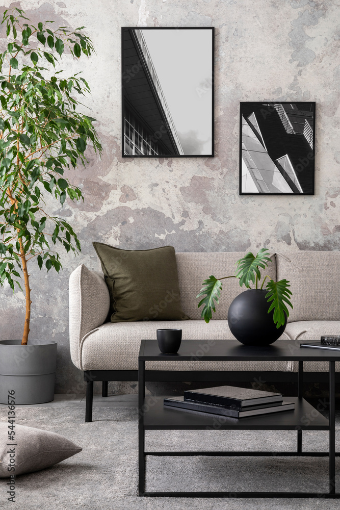 Interior design of concrete living room with mock up poster frame, gray sofa, green pillow, simple coffee table, vase with dried flowers, cup, plants in flowerpot and personal accessories. Template.
